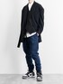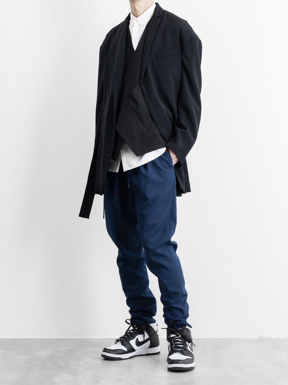 black white blue . . . oversized belted jacket short point shirt sarrouel pants dunk