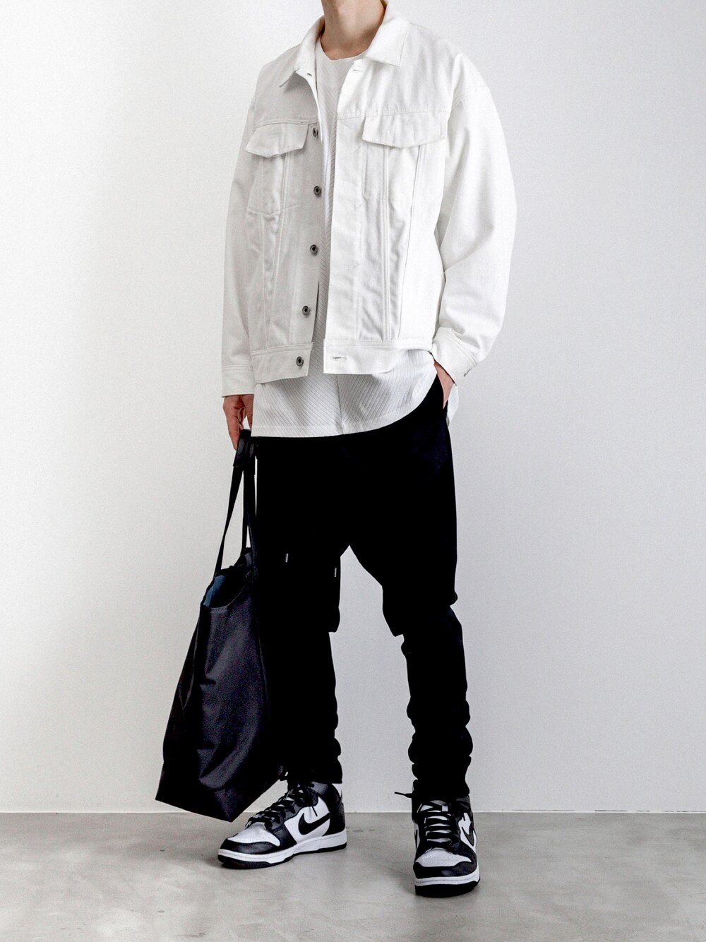 white black . . . denim jacket bias tee wool sarrousel pants dunk