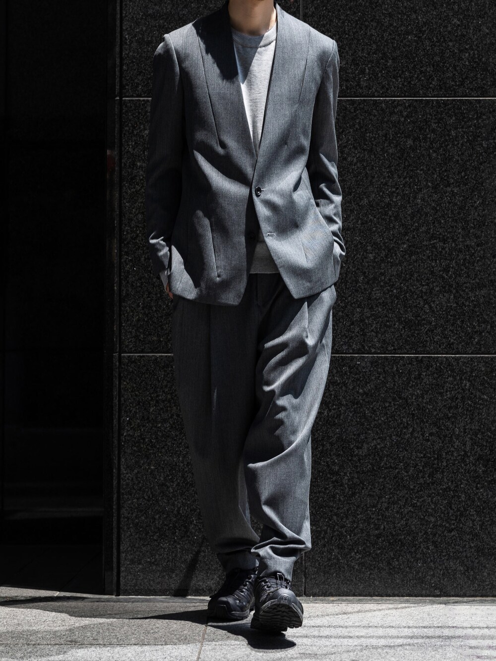 charcoal set-up . . . no collar jacket 2tuck tapered pants salomon