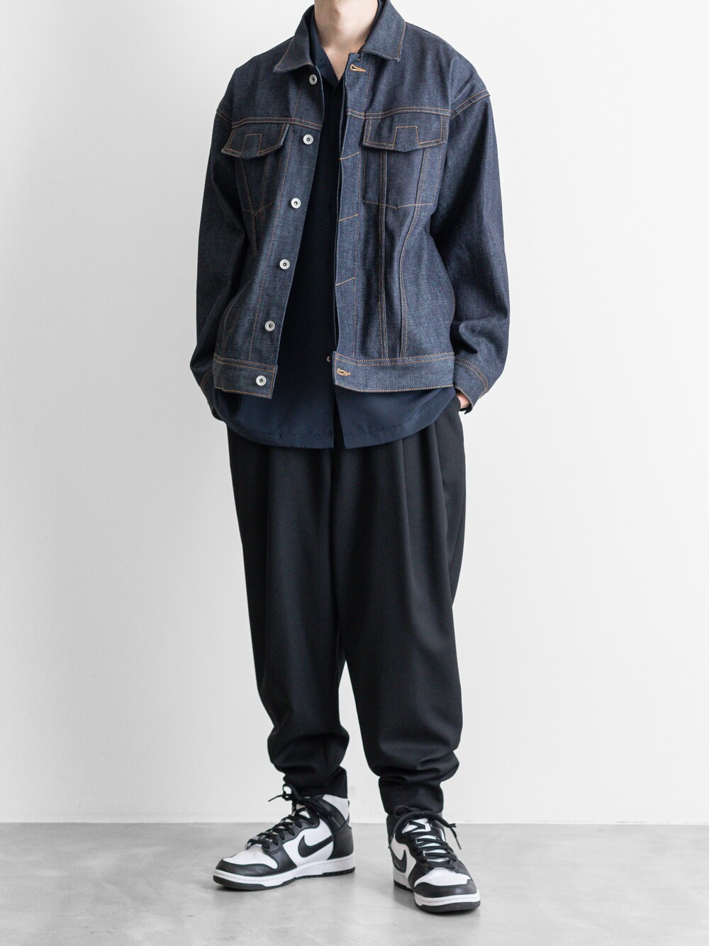 indigo navy black . . . oversized denim jacket open collar shirt with pleats 2-tuck tapered trousers dunk