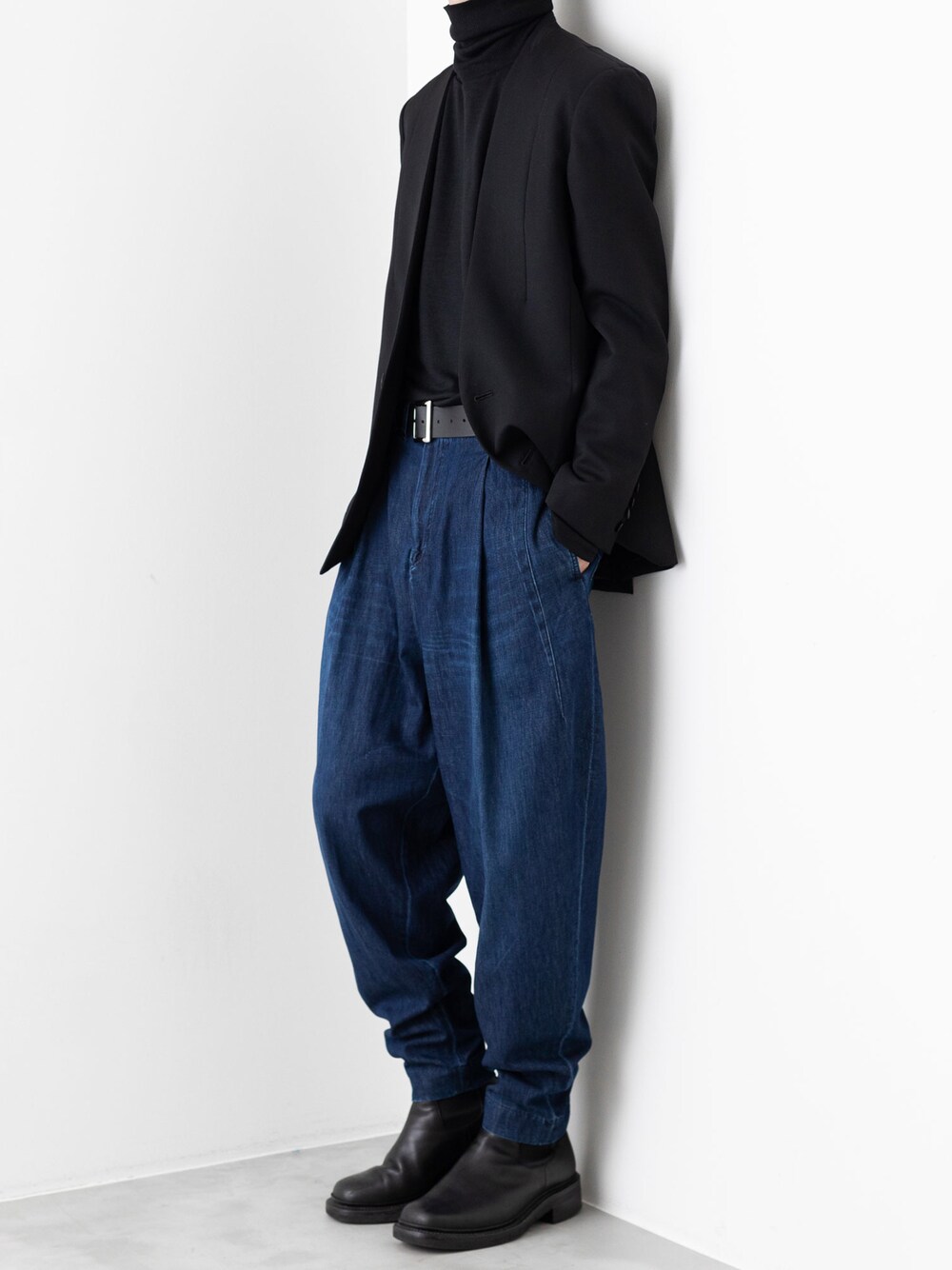 大人定番のジャケット×デニムコーデ👖 ミニマルなハイネックニットを重ねて秋冬仕様に。
