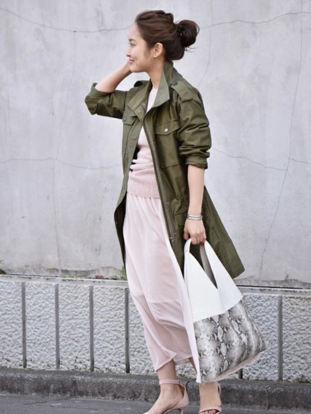 春の必須アイテム・ミリタリーコート。 定番のミリタリーコートだからこそ、こだわりの一枚を。 春らしいペールピンクを、ベルベット×ニットの異素材と合わせた上級コーディネート。 今の季節、春のカラーを入れるだけで気分も上がりそう!
