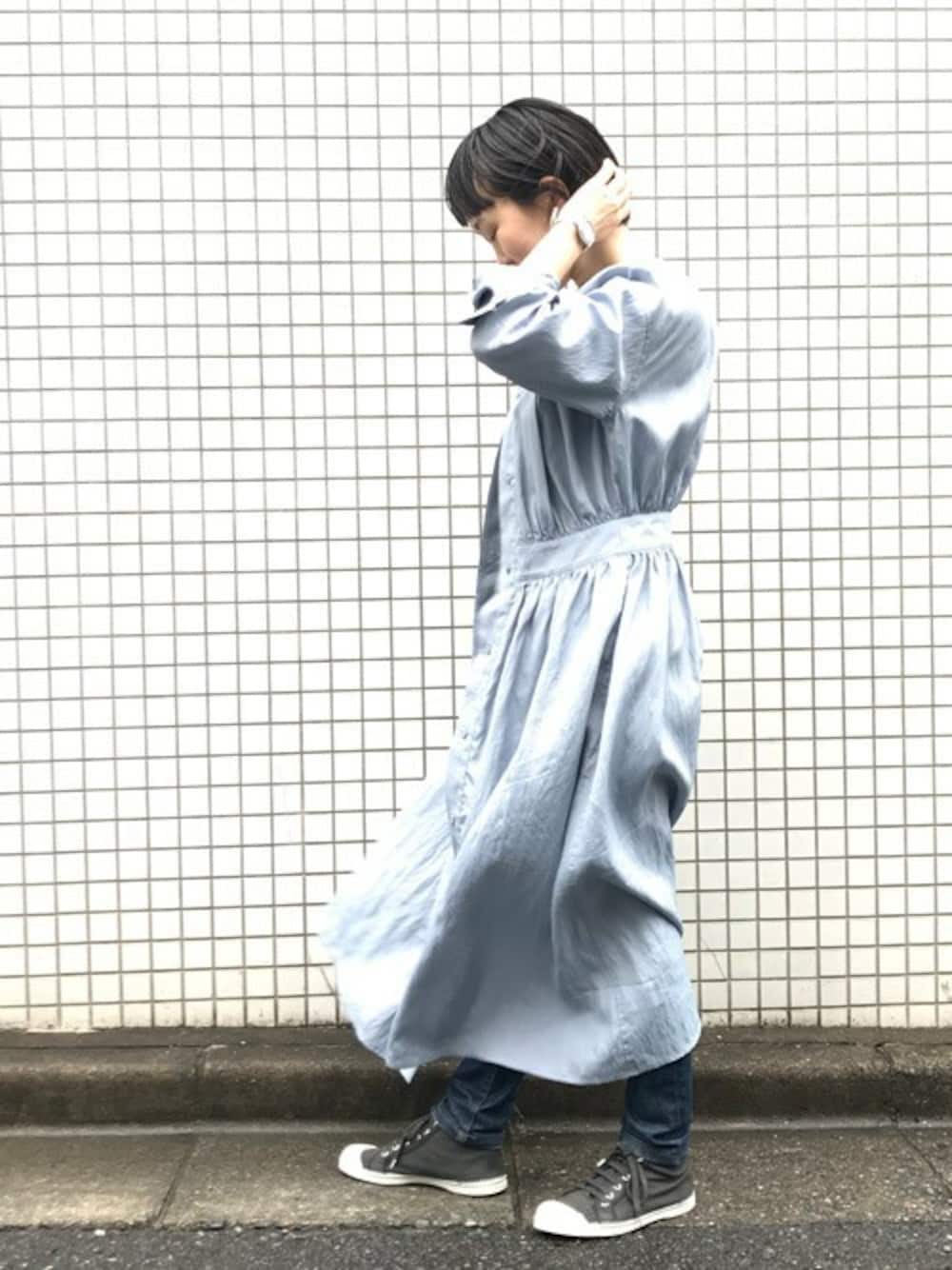 filageのワンピースを羽織りにしたコーディネート。 シューズはBensimonのMidです。