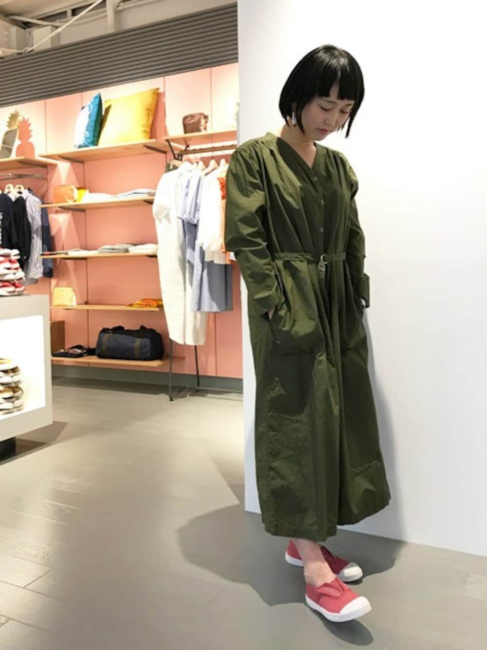 カーキワンピ x ピンクシューズのコーディネート。 シーズンカラーのスモークピンクはニュアンスがあり、大人の女性にも取り入れやすいカラ―です。