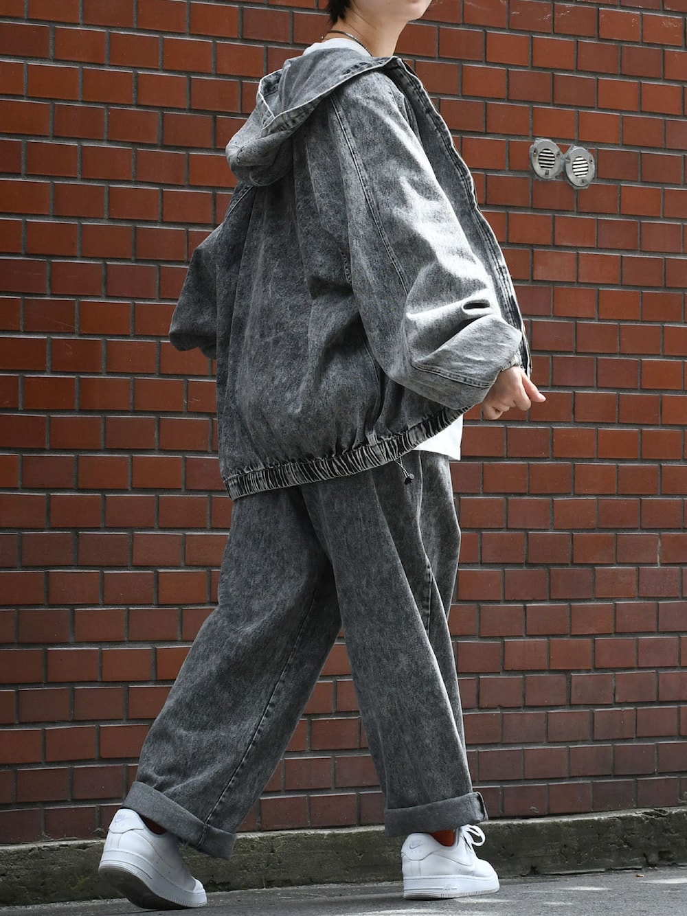 StartingOver_officialのブルゾン「vintage like hard wash denim hoodie/ヴィンテージライク ハードウォッシュ デニム ジップパーカー」を使ったコーディネート
