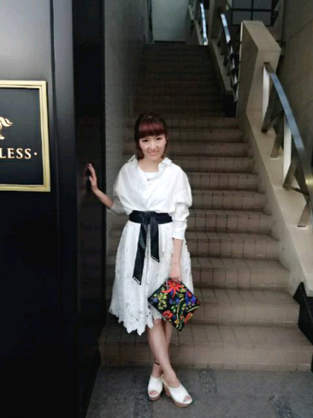 レース素材のワンピースに白シャツ合わせて爽やかに♫ ウエストにベルトを付けてメリハリをプラスしてみました(^ ^)