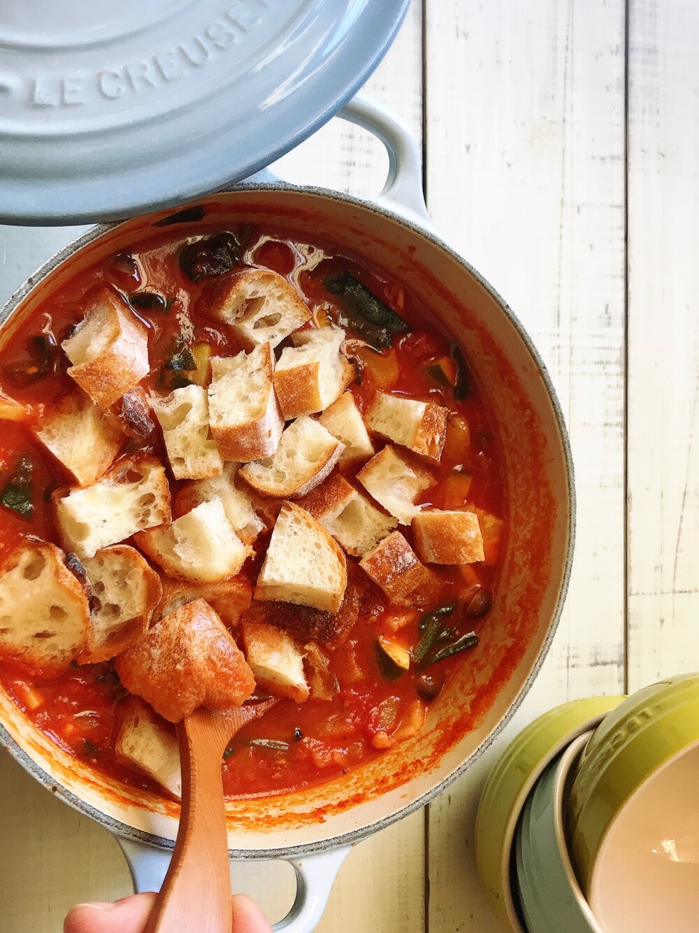 ココットロンドの20cmはマルチに使える強い味方❤️ 硬くなったバケットを使いリボリータを🥘ご飯も2合炊くのに丁度いい😊 ボウルはスープ以外にサラダやシリアルを入れてもgood