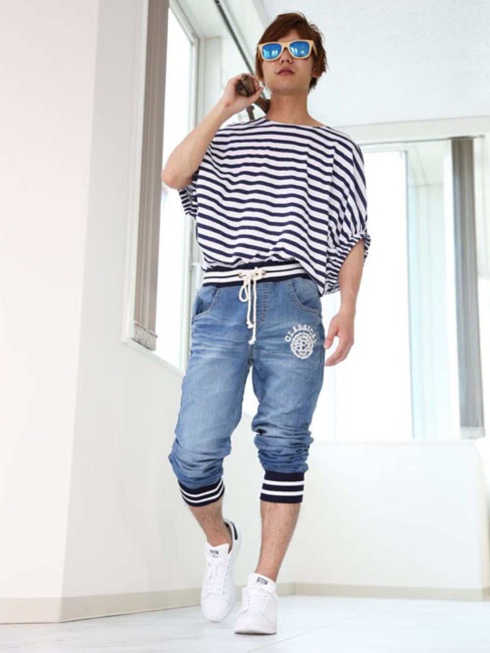 ボクちゃんの真面目コーデからのケンカ上等じゃー的なポーズ ゆったりボーダートップスからのお馴染みランデニくん