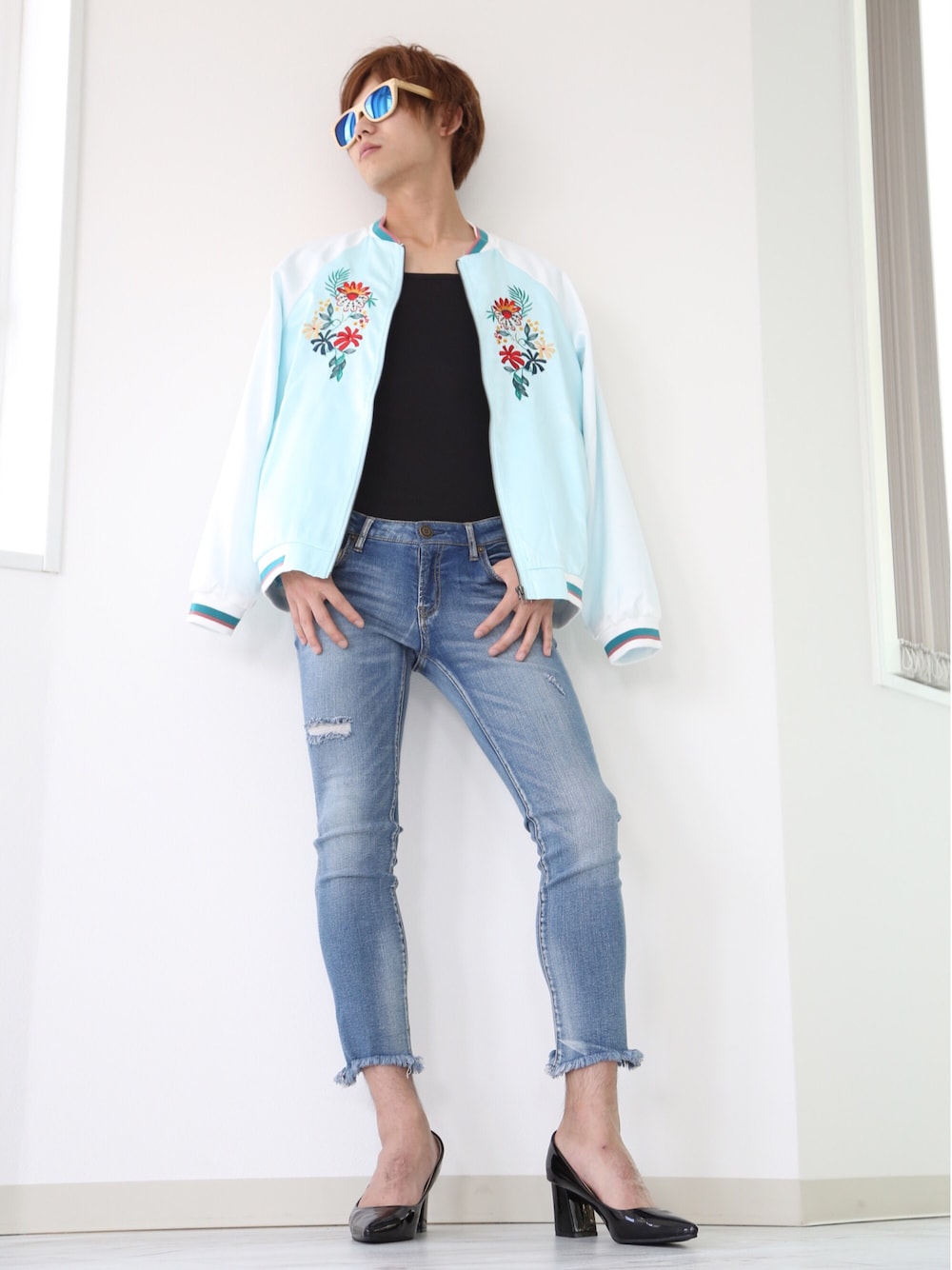 ボクちゃんのひとつ外しコーデ サテンカラーのスカジャンに 変形裾フリンジのスキニーパンツ