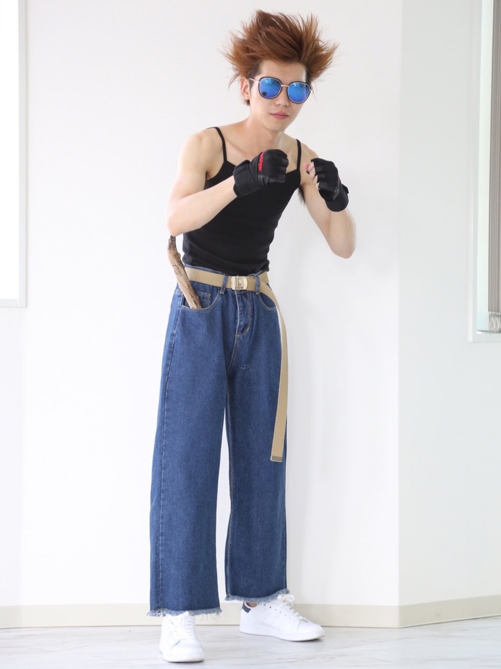 ボクちゃんの某格闘ゲームにいそうなキャラコーデ どう? 波〇拳とか打ちそうでしょ?w ちなみに一応言っておくけど下のワイドデニムパンツとか普通に穿けば可愛いから安心してねww