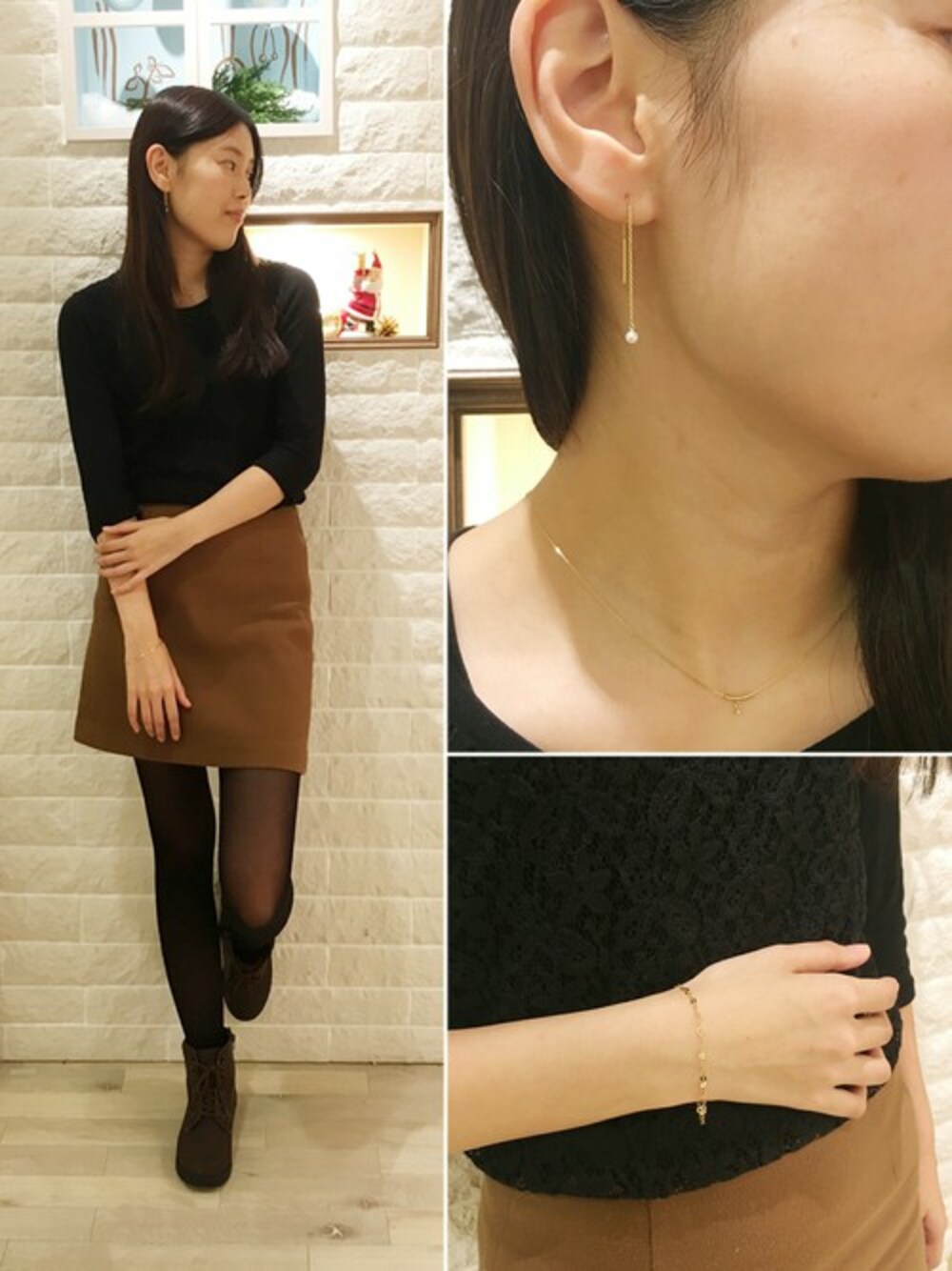 タイトスカートにレースのぴったりシルエットのトップスを合わせたシンプルコーデです! 耳元には小さめのパールがついた大人っぽい揺れピアスを♪ 手元にはお花が連なったデザインのブレスレトを着けました! 一つ一つのお花がキラキラと反射して存在感のあるデザインで、シンプルコーデを引き立ててくれますよ!