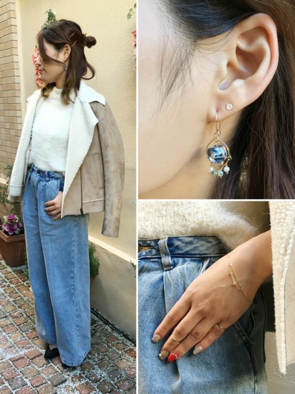 春を意識して明るいカラーでまとめたシンプルコーデです♪ 耳には今日から発売の春コレクションCaleidoscopioのトンボ玉のピアスを♪♪ 光りを吸い込むようなトンボ玉はコーデを引き締めてくれるアクセントになります! 手元にはダイヤモンドのリングとブレスレットを! これから春に向けてカワイイアイテムたちを集めていきたいです!