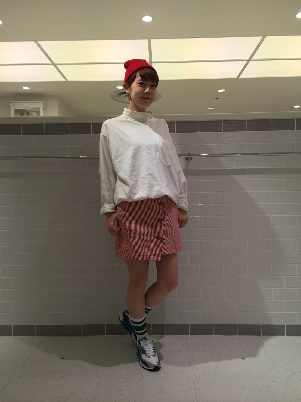赤のニット帽に赤のスカート。 足元はグリーンで合わせたカラフルコーデ✴︎