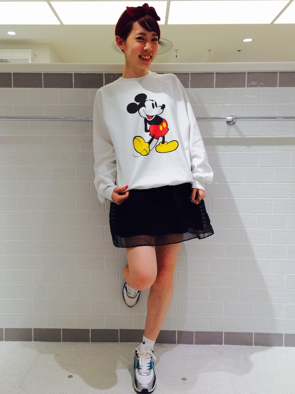 BEAMS Planetsで買ったヴィンテージのミッキースウェットはサイズ感とPOPな色味がお気に入り♡ ちなみにまだグレーがラスト一点残ってます! このスカートを履いているといつも宇宙人みたいって言われるので耳元には宇宙人を♩