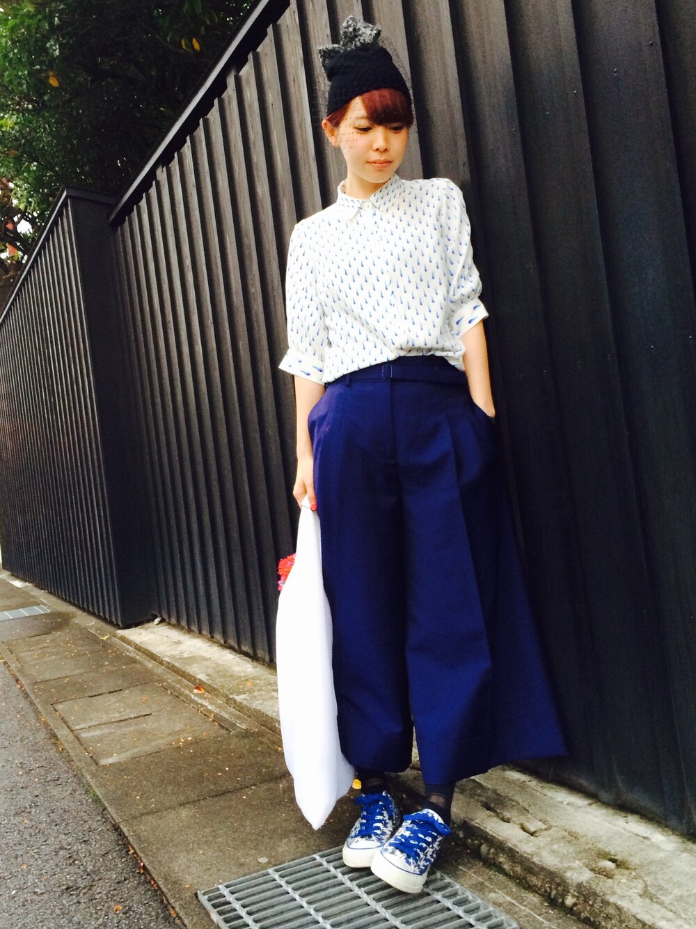 生憎のお天気なのでしずく柄のシャツをメインにブルーで合わせました☺︎ Acneのパンツはとにかくシルエットがきれい! 一生履けます。 髪の毛切りたい〜〜〜
