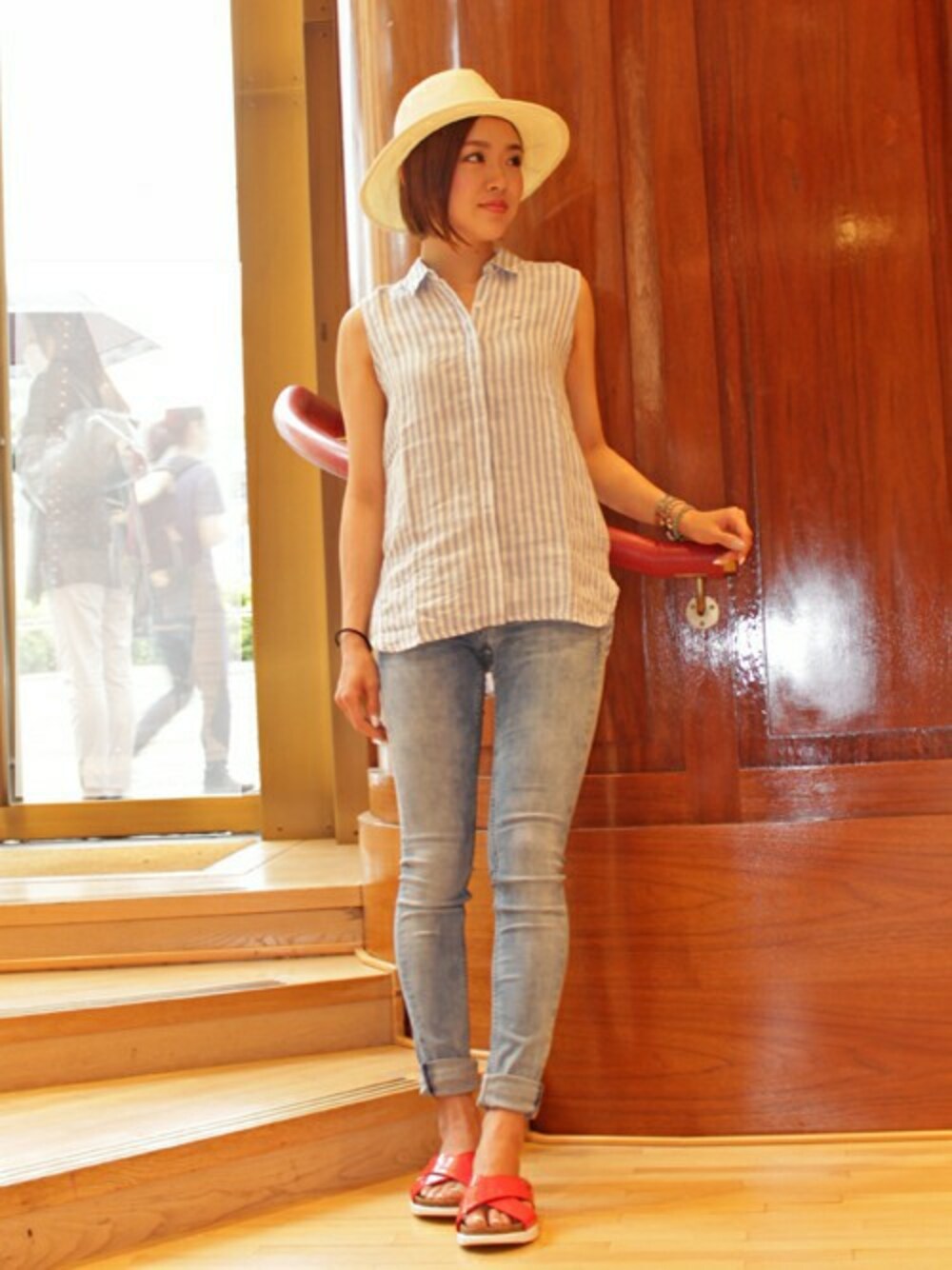 パワーストレッチデニムとスリーブレスシャツの縦長Iラインコーデ。 シャツはさらっとした肌触りのリネン素材で、クールなストライプのシャツカラー。 これからの季節にマストハブなアイテムです! ちょっとかしこまった気分や、カジュアルを押さえめにしたい日のために、1枚あると本当に便利です! そして足元は一押しのベルトサンダル!!! 他にない絶妙なカラーのチェリーピンクがかわいいです。 デニムにもモノトーンにも映えて、テンションもちょっと上がります。
