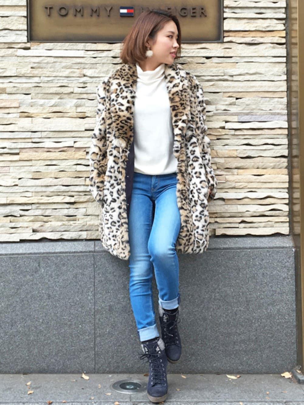 大胆にヒョウ柄を配したコートにロールトップのニットを合わせ、ウオッシュの効いたデニムパンツを組んだアクティブでありながらポップさを盛り込んだスタイリングです。 レースアップブーツを足元に組んだ事で脚長効果を持たせました。 冬の街中でもインパクトを持たせたコーディネートです。