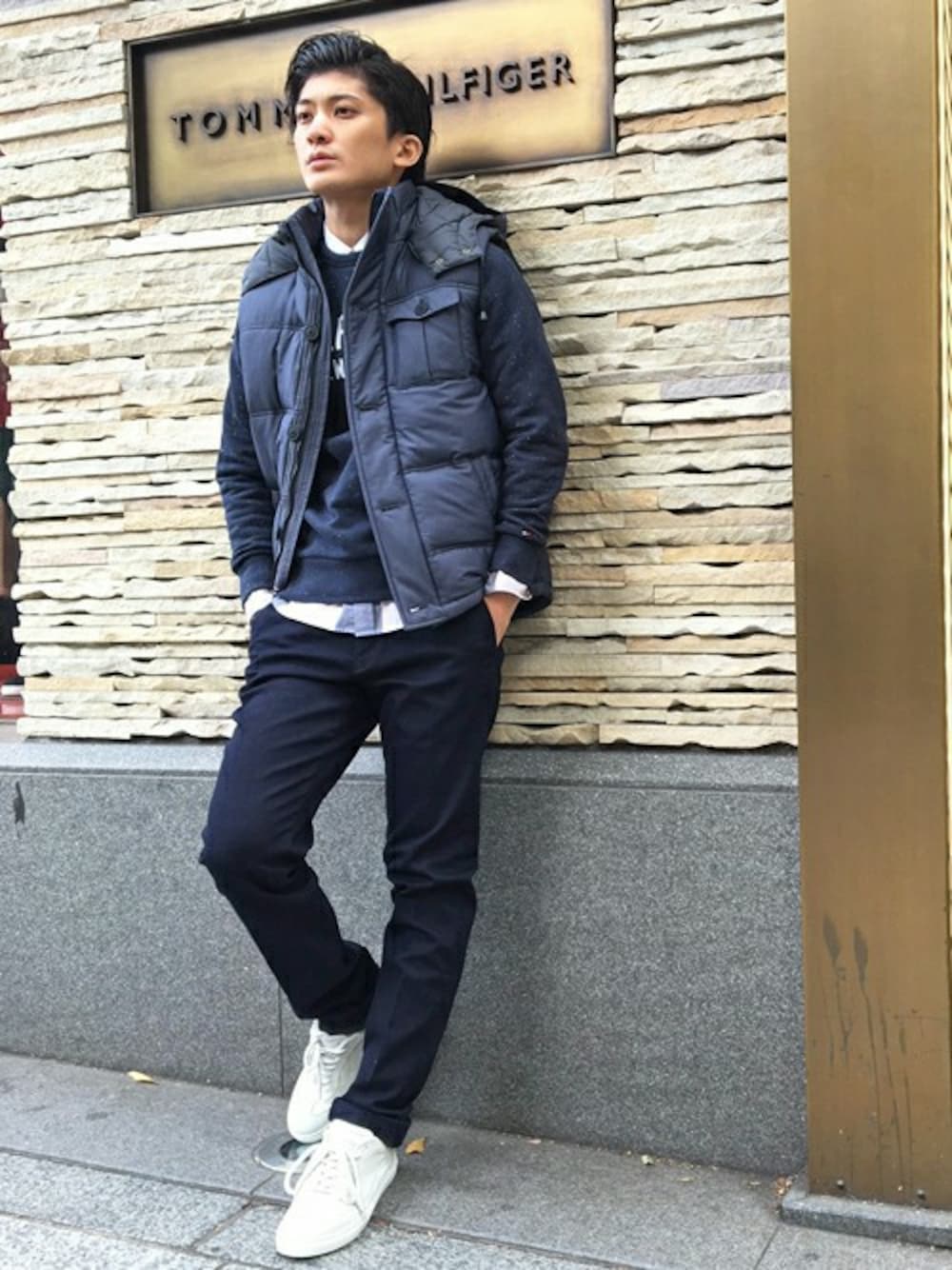 1トーンでまとめたコーディネートです。シックなネイビーに白のスニーカーと裾から覗くチェックがポイントです。 大人のカジュアルスタイルです。