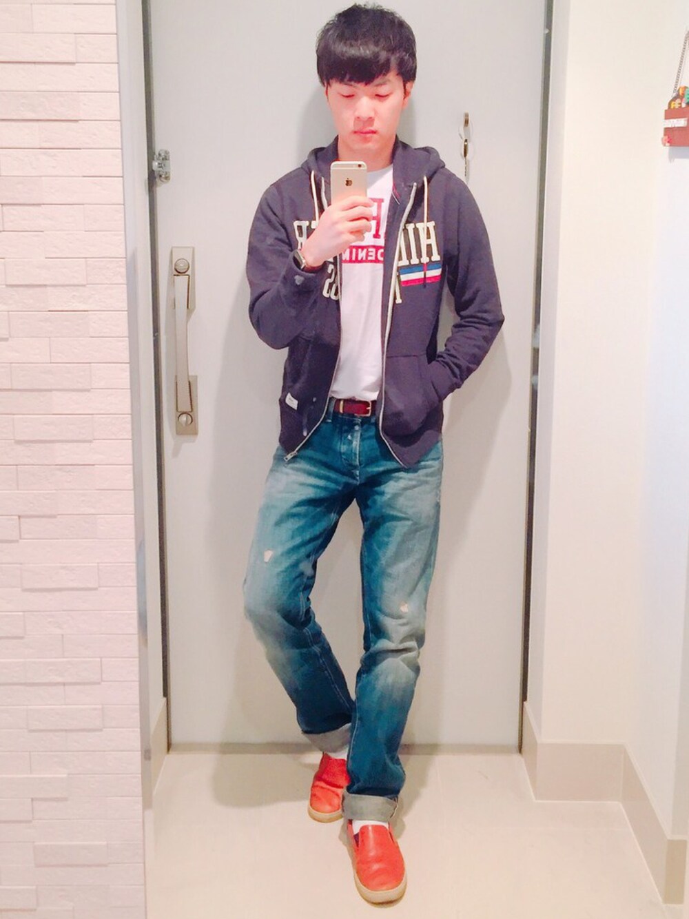 今日はシンプルにジーパンにTシャツ。 春の気温差に対応するためパーカー1枚を。 暑い時は腰に巻いたり、肩にかけたり色んな雰囲気を楽しめます。