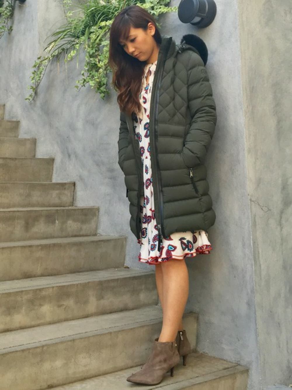 TOMMY HILFIGERの今年一押しのストレッチ素材のダウンコート。 キックバックの強いストレッチ素材なので、ダウンにありがちな着ぶくれ感もなく、ニットを着てもミニマルフイットが叶います♪ ファスナーやポケット部分のレザー調のマテリアルのエッジも効いています。 フレアのペイズリーワンピースと合わせて、大人のフェミニンなスタイルに仕上げました。