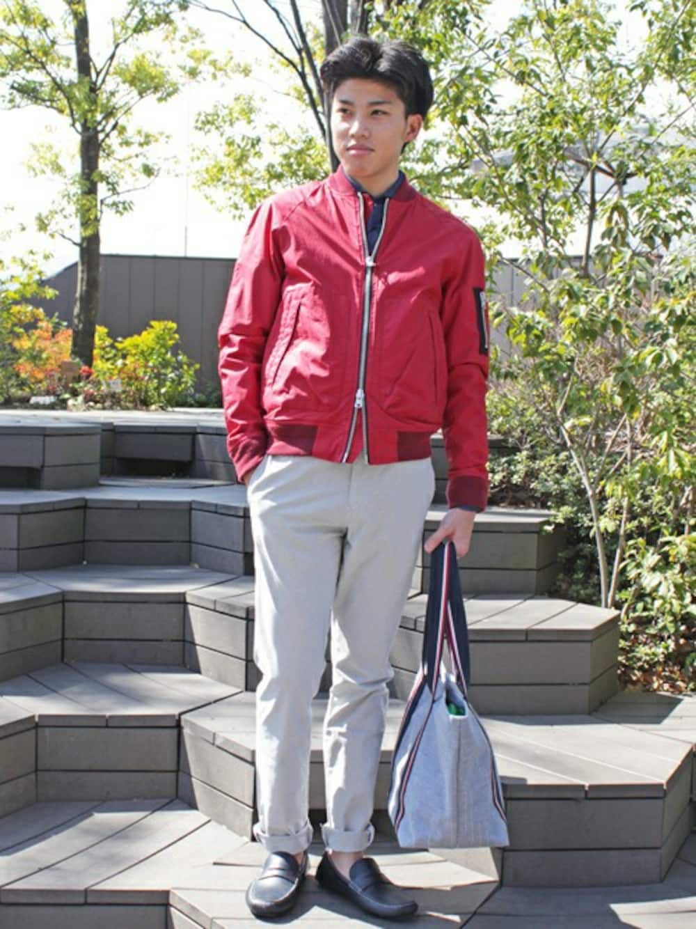 この春は久しぶりにカラーアウターを着たい気分。 トレンドから定番化しつつあるボマージャケットは、今シーズンならレッドもお勧めです。 落ち着いた色味のレッドなので、ネイビーやグレー、ブルーと相性がよく、ワードローブに抵抗なく取り入れられました。 今日はシャープな落ち感のコットンチノを合わせ、スタイリッシュなシルエットに。 衿元から少し見えるデニムシャツが全体を引き締めています。明るいブルーよりも濃いめのネイビーブルーの方がまとまりがよく感じました。