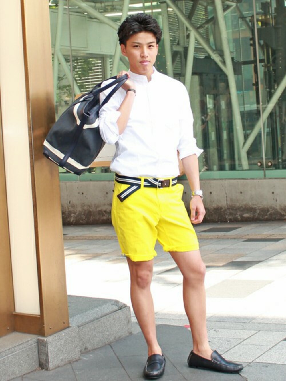 カラフルなビジネススタイル。 暑い日はノーネクタイが気にならないマンダリンカラーのシャツをチョイス。 マンダリンカラーはレギュラーカラーシャツと同じくらいきちんと感がありつつ、オーソドックスとは違った魅力のあるディテールです。 スタイリッシュに使えるので1枚あるととても便利なお勧め白シャツです。 ハーフ丈のカラーボトムはTOMMY HILFIGERのロングセラーボトム。 潔いくらいにビビッドなイエローは、堂々と穿きこなしたもの勝ちです。 ネイビーの小物で引き締めて全体はあくまで大人っぽくまとめています。