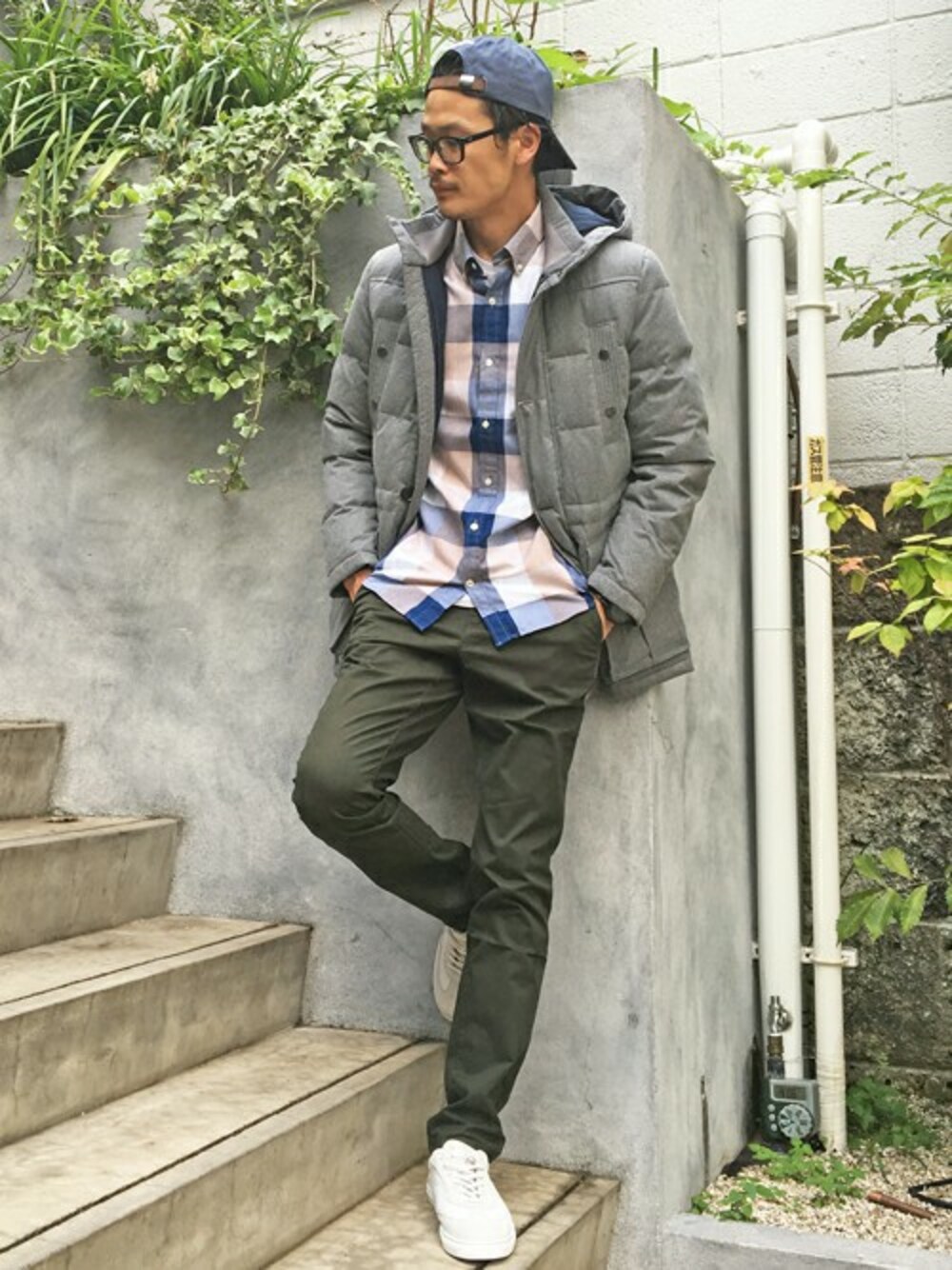 ミドル丈のダウンジャケットにチェックシャツを組み合わせました。 カジュアルなアイテムでいながら落ち着いた雰囲気を持ち合わせたコーディネートです。
