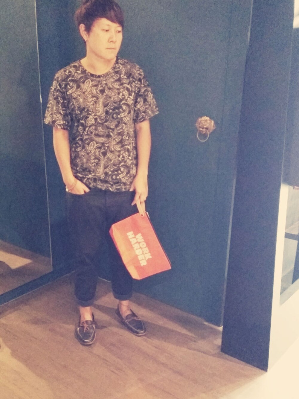 Jermaine is wearing [T-Shirt] Black Paisley Tee,Import Brand [Pants] -J-A-S-O-N-, Singapore [Bracelet] Attaboy, Singapore