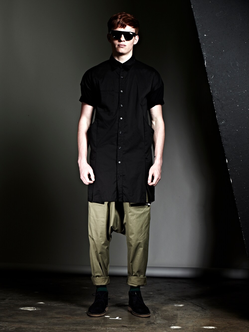 Model is wearing Center back white piping short sleeve shirt with camo harem pants. All from -J-A-S-O-N-