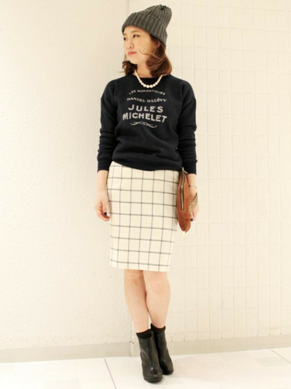 チェックスカートにスウェット、ニット帽でトレンド本命のコーデ♪