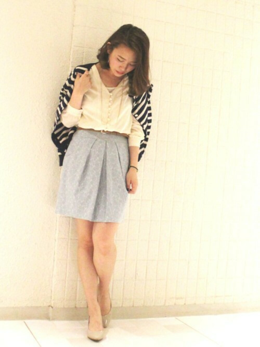 ボーダーカーデを肩がけすることでぐっと大人っぽく☆ きれい色ジャガードスカートが春らしくて◎