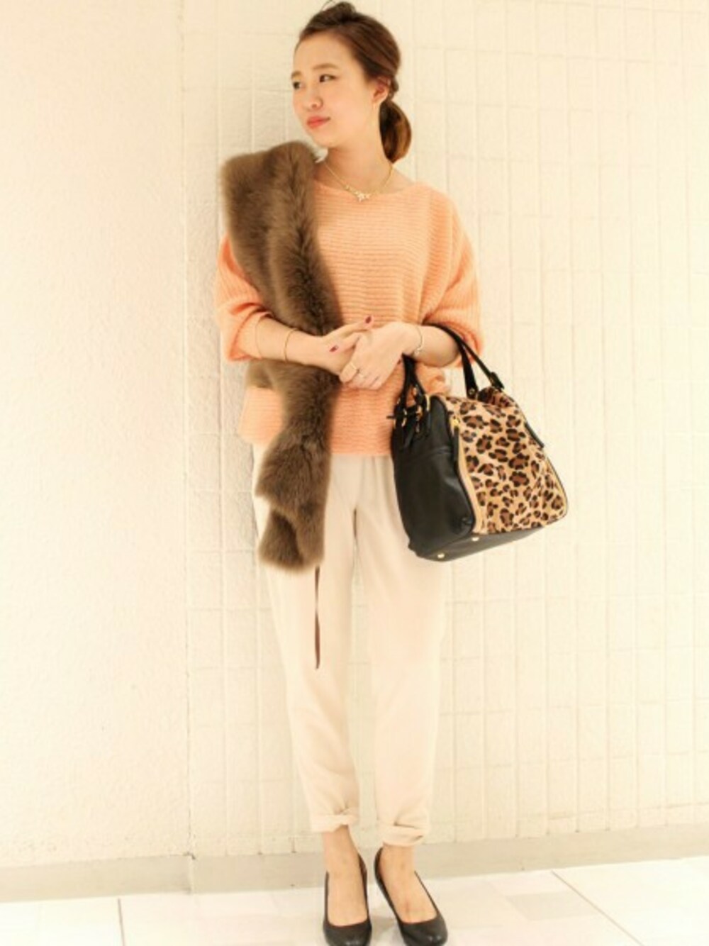 ニットを色を引き立たせるためにオフホワイトのパンツを合わせて。華やかな小物使いがポイント♪