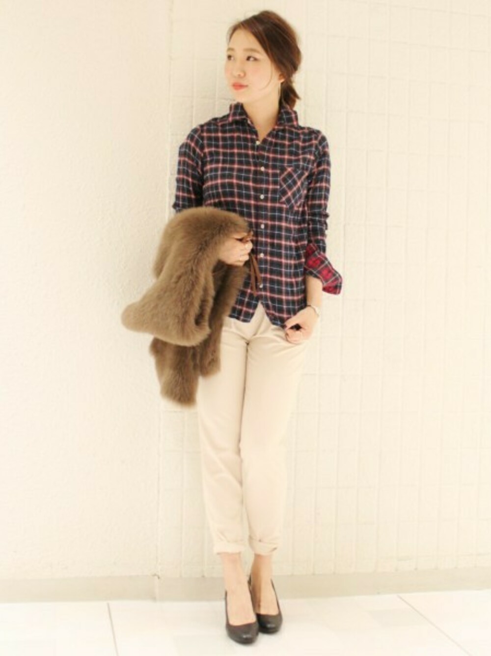 ラインがきれいで着やせ効果抜群のチェックシャツはファー小物で秋冬気分を盛り上げて☆