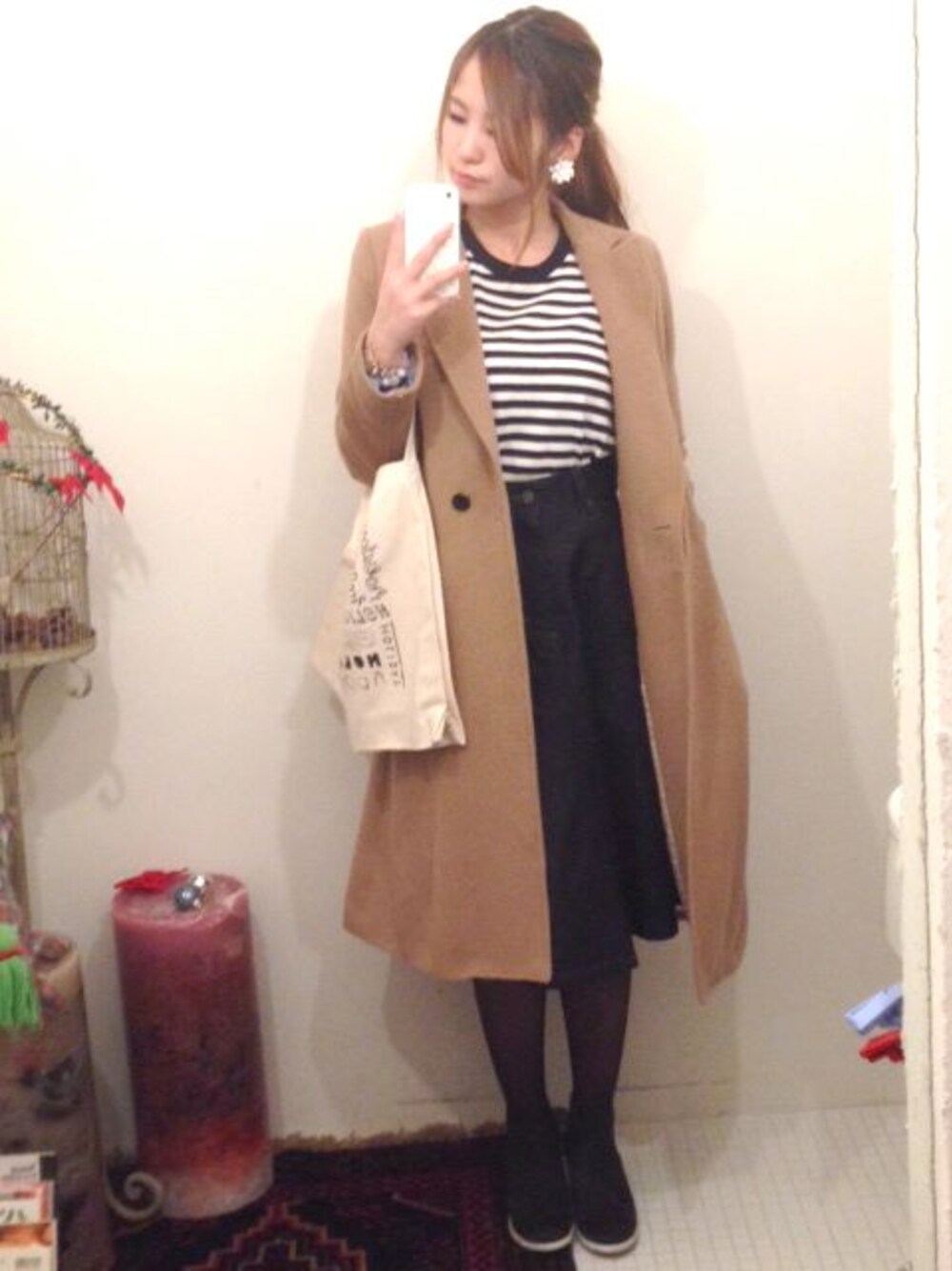 コート : PHEENY トップス、バック : holiday スカート : made in HEAVEN ブーツ : mollini シンプルなコーデにはディティールや素材にこだわった フィーニーのコートが抜群に合う!