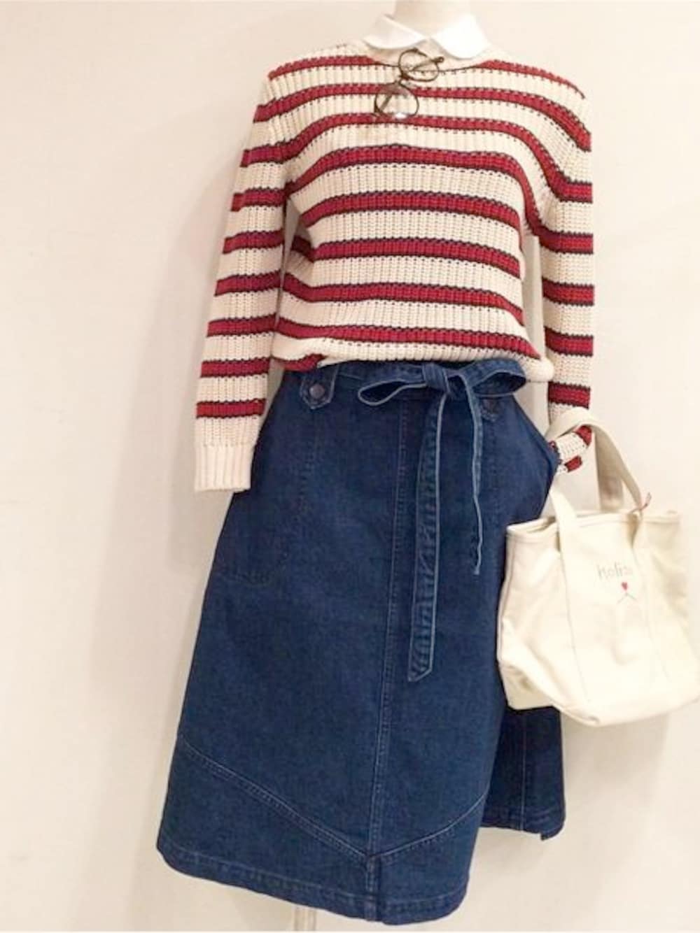 PHEENYのred×o.whtの柔らかい印象になるボーダーコットンニットとデニムの巻きスカートでルンルン♪気分で♪