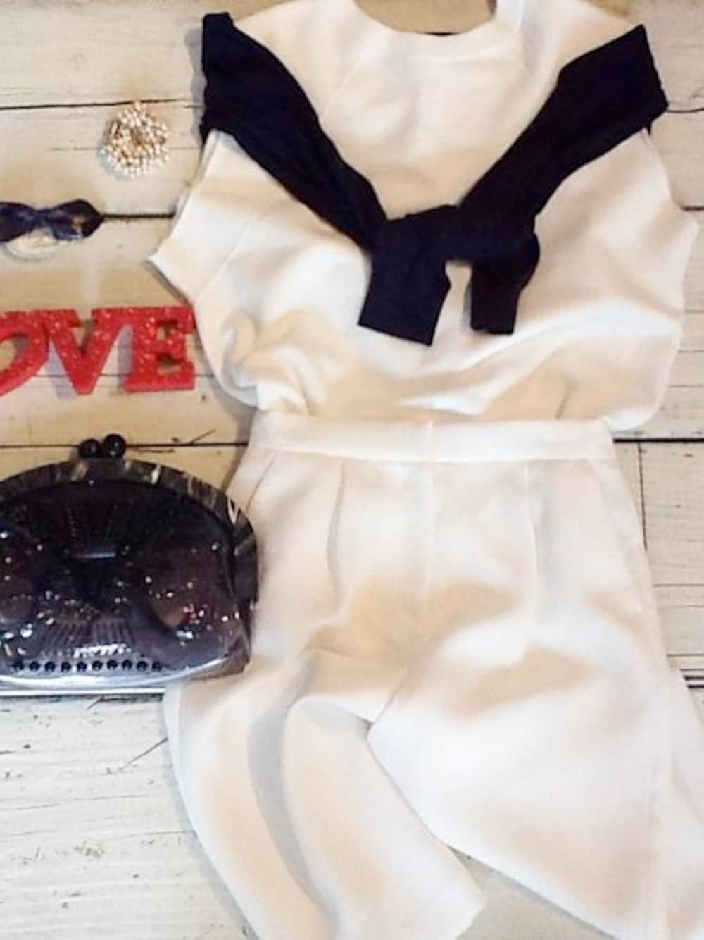 オールホワイトコーデは ネイビーのカーディガンでバランス良く!