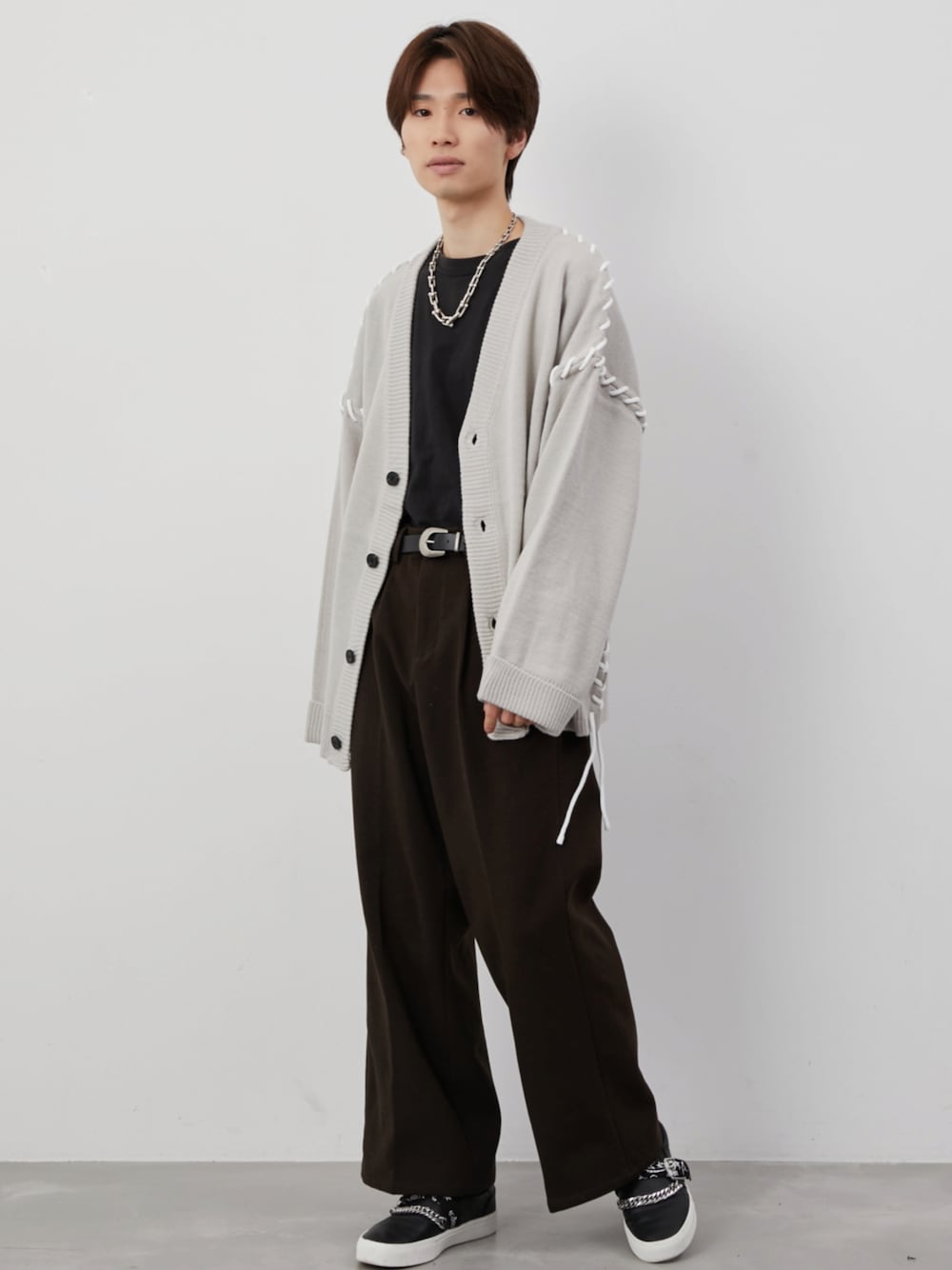TOBIのカーディガン/ボレロ「【MASAKI × JUNRed】ステッチレースアップルーズカーディガン」を使ったコーディネート