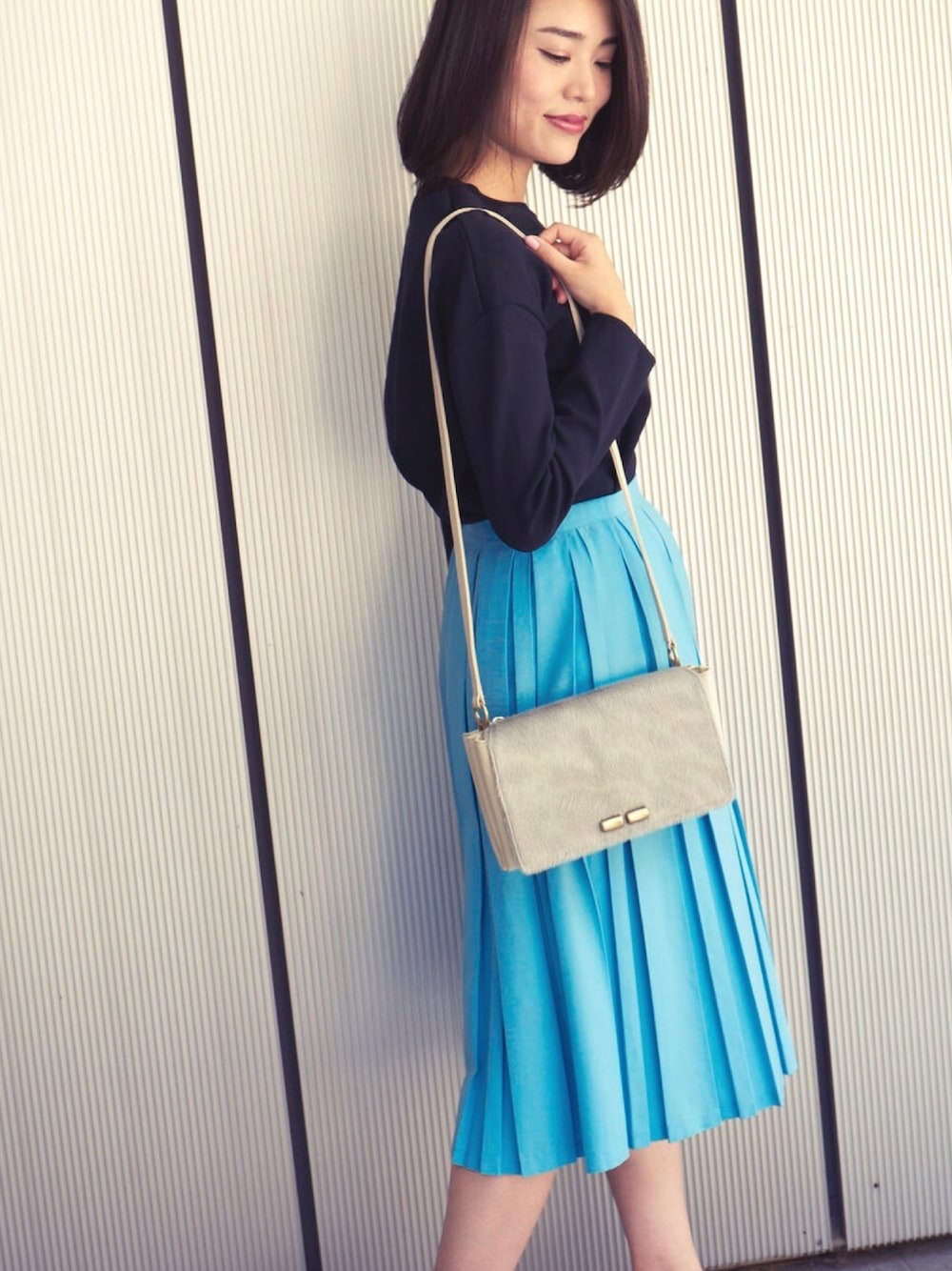 カラーニット、カラースカート… 鮮やかカラーが気分なこの頃。 どんな色にもすっと馴染んで、 かつ華やぎをプラスしてくれるヘアー付きレザーのミニバッグがポイントです。