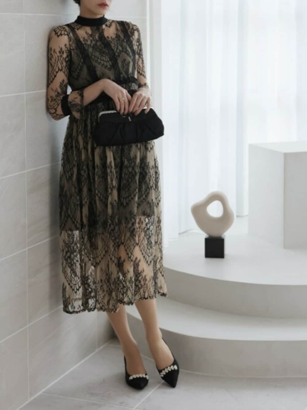 VIVIAN COLLECTION(VIVIAN COLLECTION)のパンプス「ビジューパール飾りグリッターレースパンプス」を使ったコーディネート