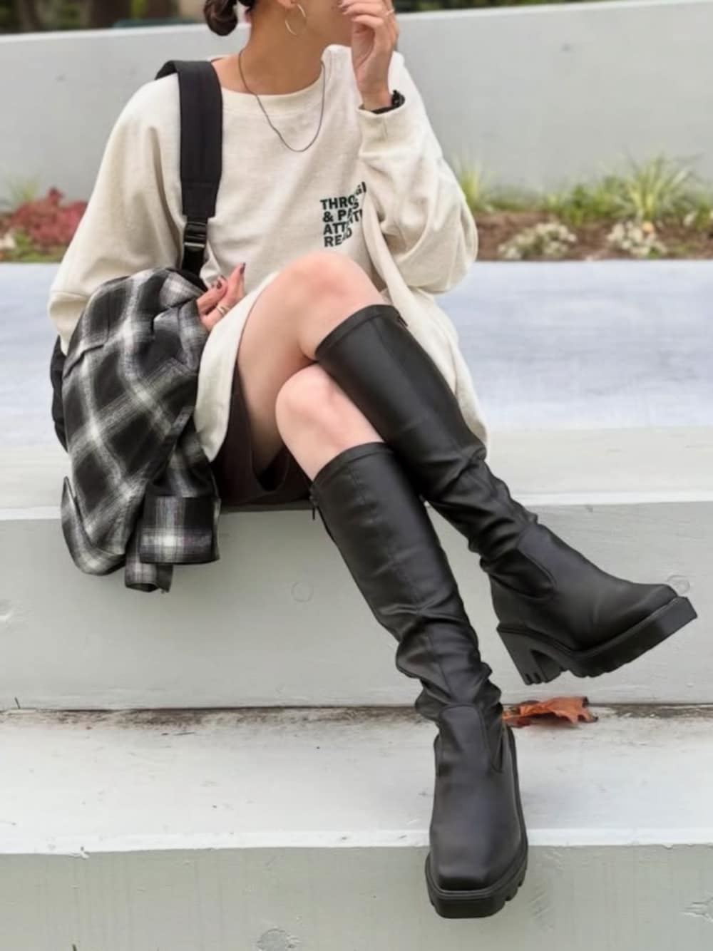 ブラック系のブーツを着用したレディースの秋コーディネートの1枚目の写真