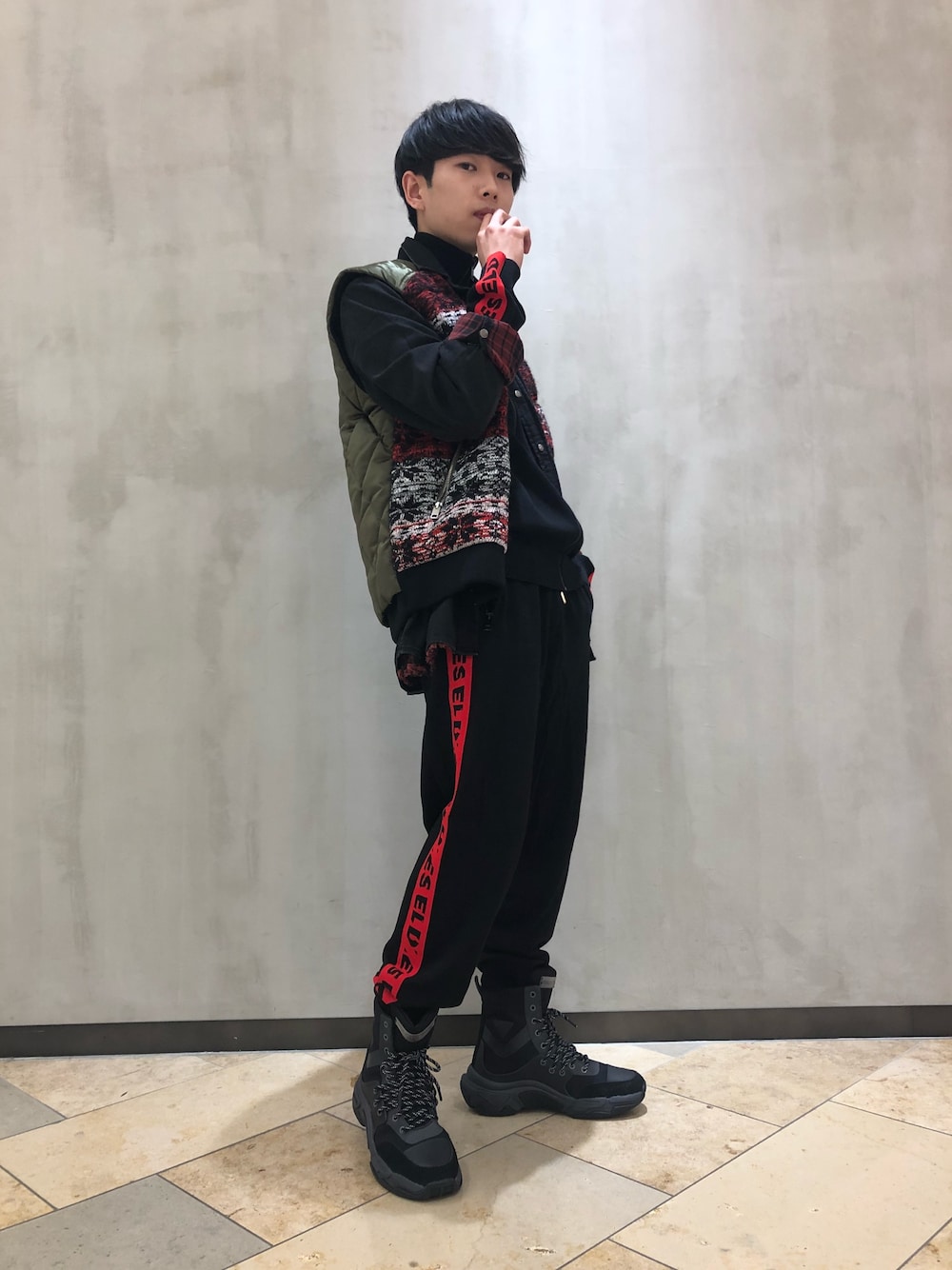赤ベースのレイヤードスタイル🔥🔥 朝晩冷え込むこの時期にぴったりのニットベスト🙏💯 新作のダッドスニーカーも熱いです!