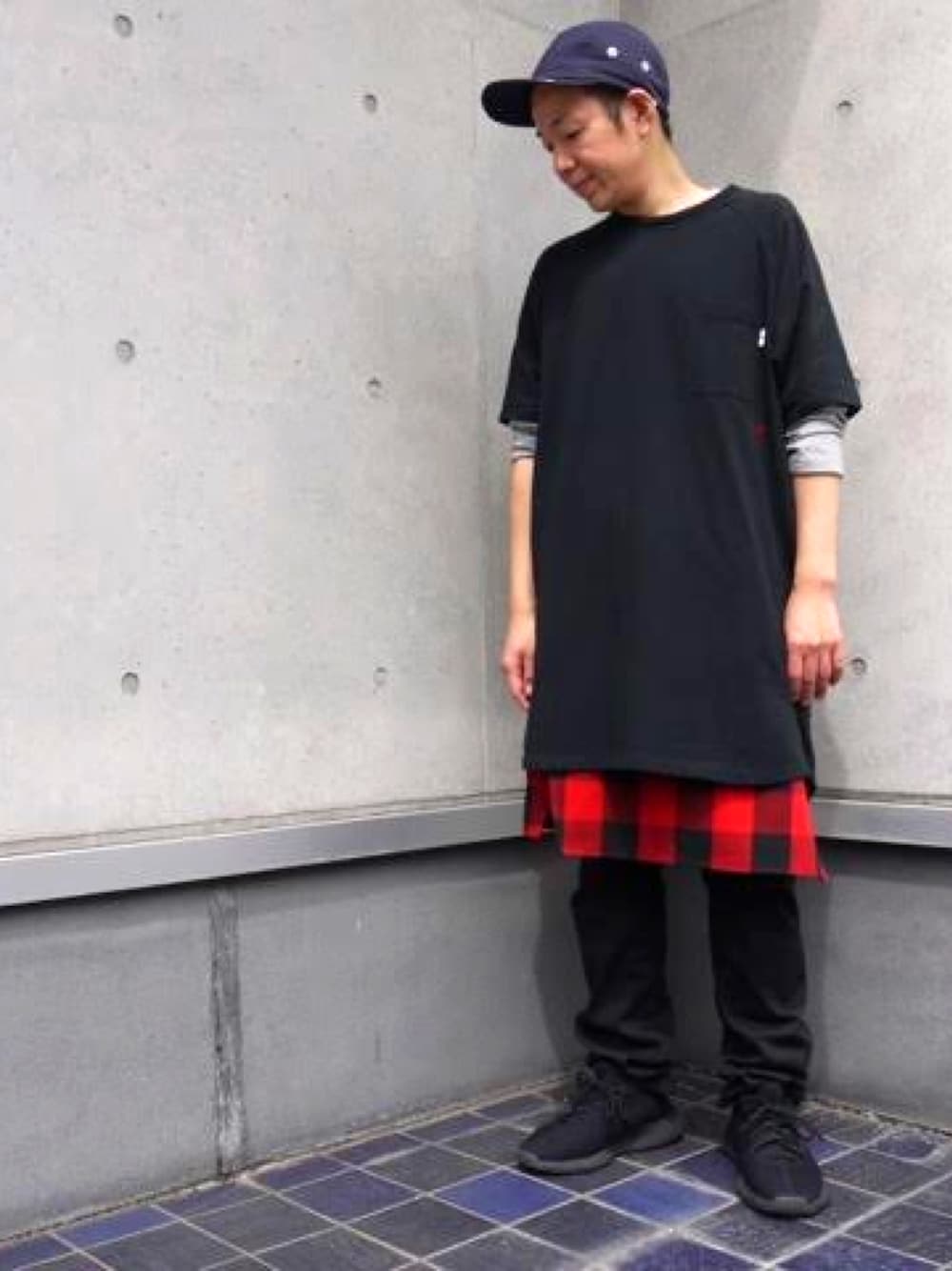 ロング丈レイヤード キャップ×ロング丈T×カットソー×ブラックデニム×yeezy