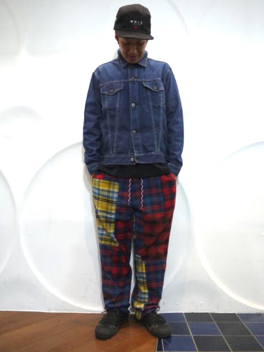 以外に合わせやすい、派手なパッチワークチェックパンツスタイル キャップ×デニムジャケット×ロンT×パッチワークチェックパンツ×スニーカー