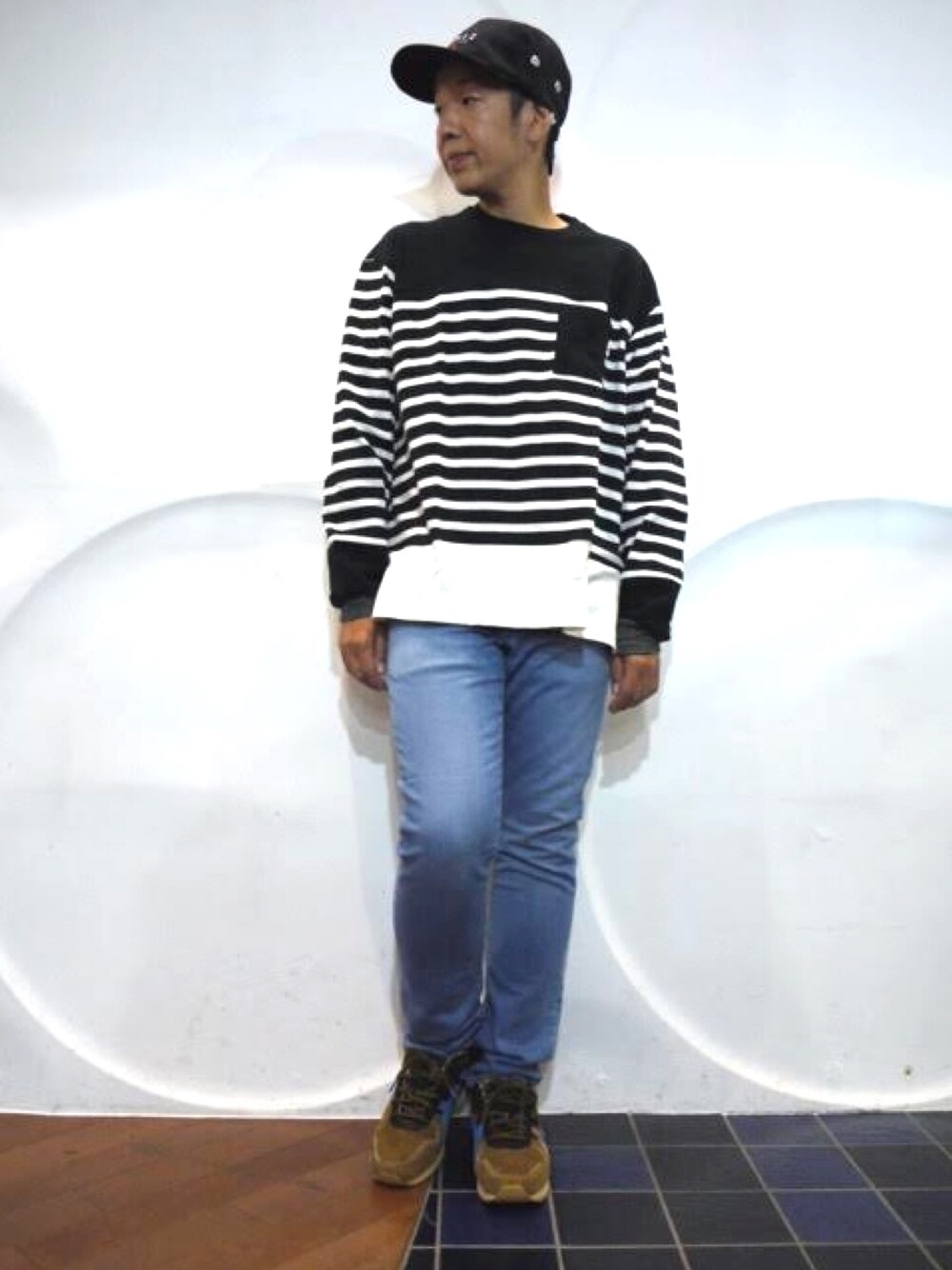 ぱっと見普通なコーディネート 凝った切り替えボーダーにフェイクデニムパンツ