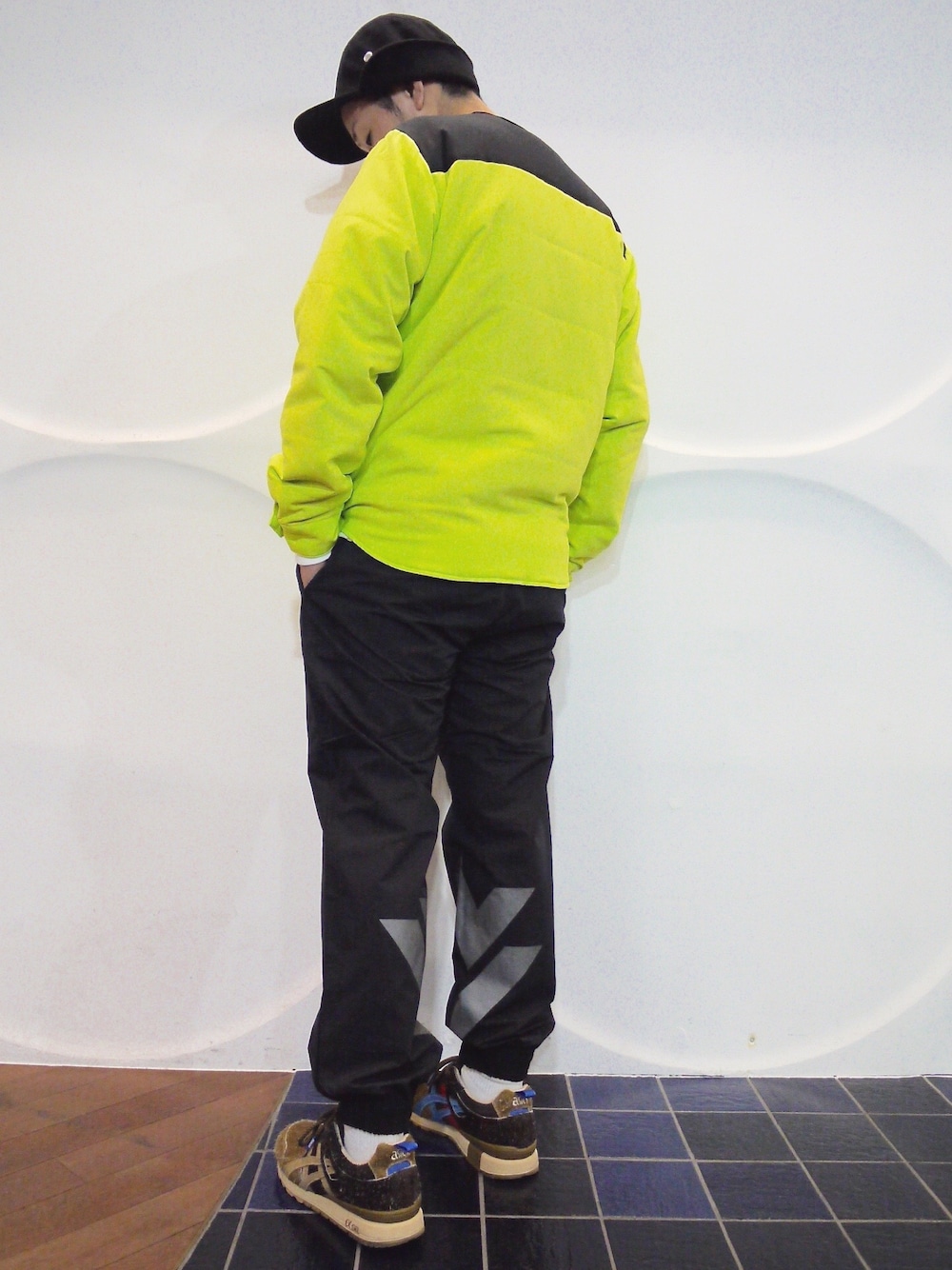 ハイテク且つ派手 フリースCAP×蛍光中綿入りシャツ×ナイロンパンツ×スニーカー