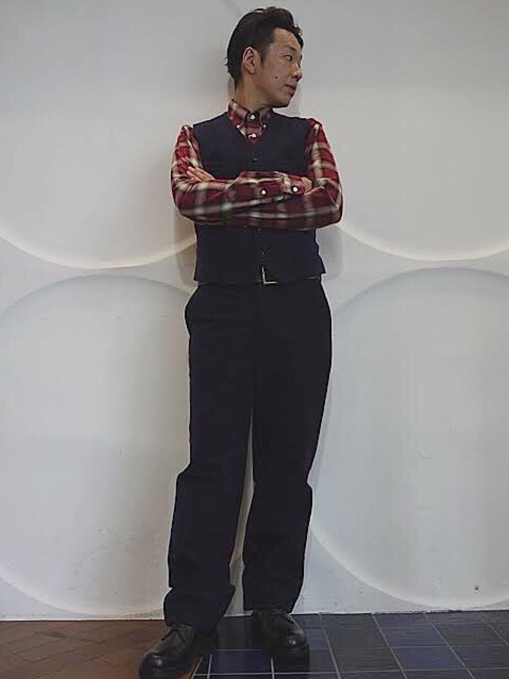 ビシッと2ピースでクラシックスタイル TENDERLOINコラボのモールスキンベストとパンツ×チェックシャツ×HTCコラボベルト×ツボウチヒロシコラボシューズ