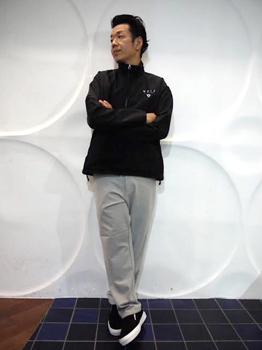 モノトーンなスポーツスタイル フリースプルオーバー×ストレッチイージーパンツ×スエードスリッポン