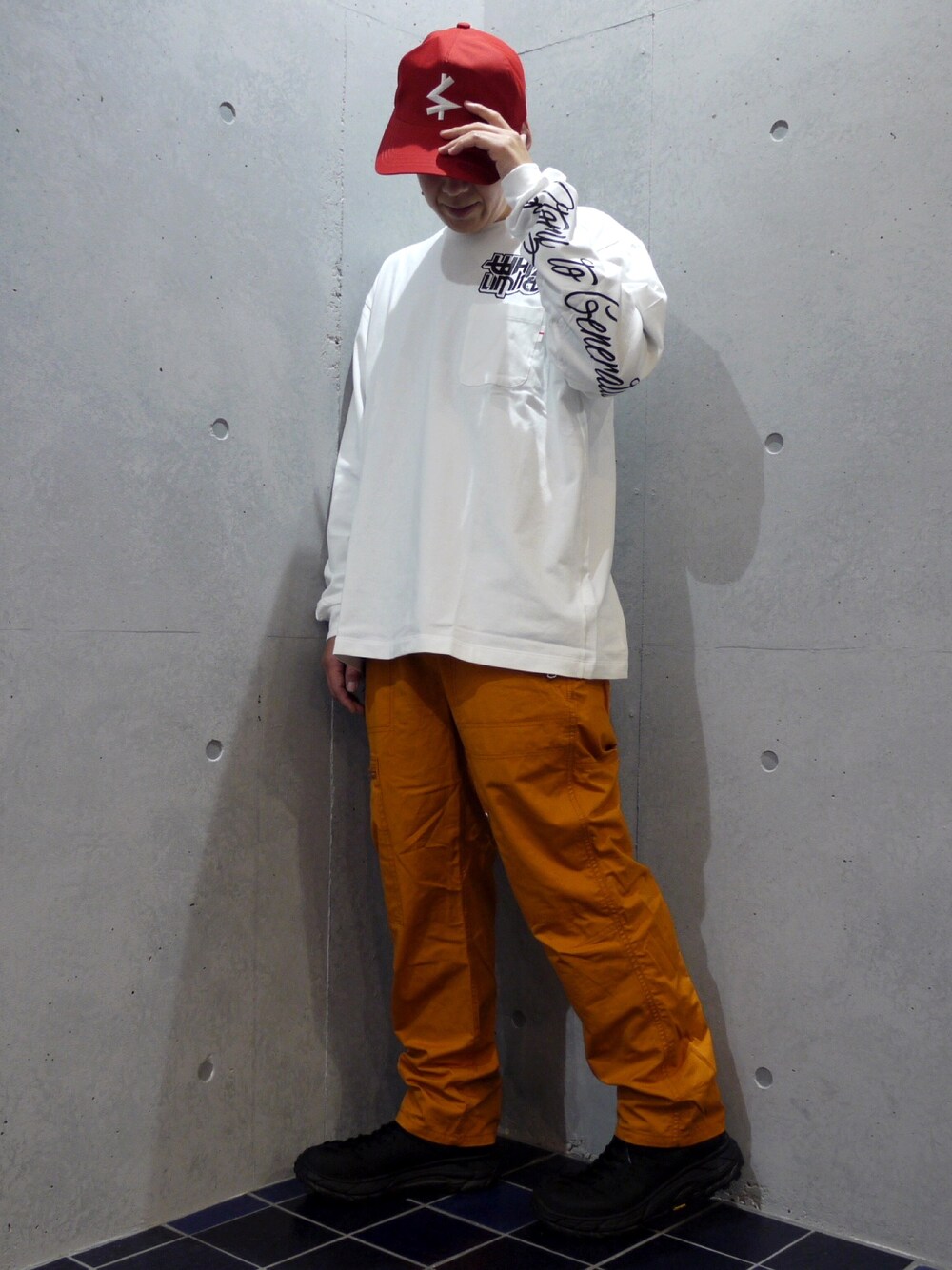 赤やオレンジの明るいカラーを取り入れたコーディネート サイズも上げて CAP × ロンT × パラシュートパンツ × ゴツめのスニーカー