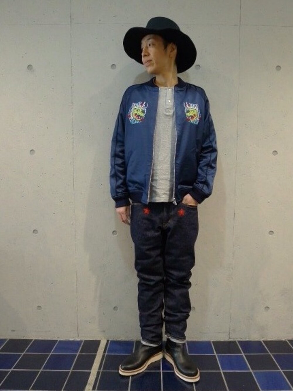 ハット×スカジャン×ヘンリーネック×デニム×ブーツ