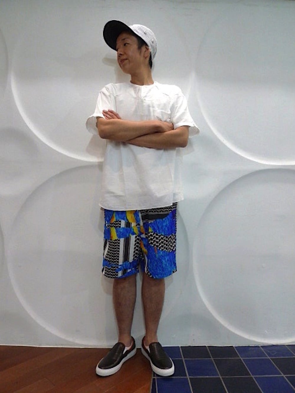 キャップ × ノーカラーガーゼシャツ ×アロハショーツ ×スリッポン